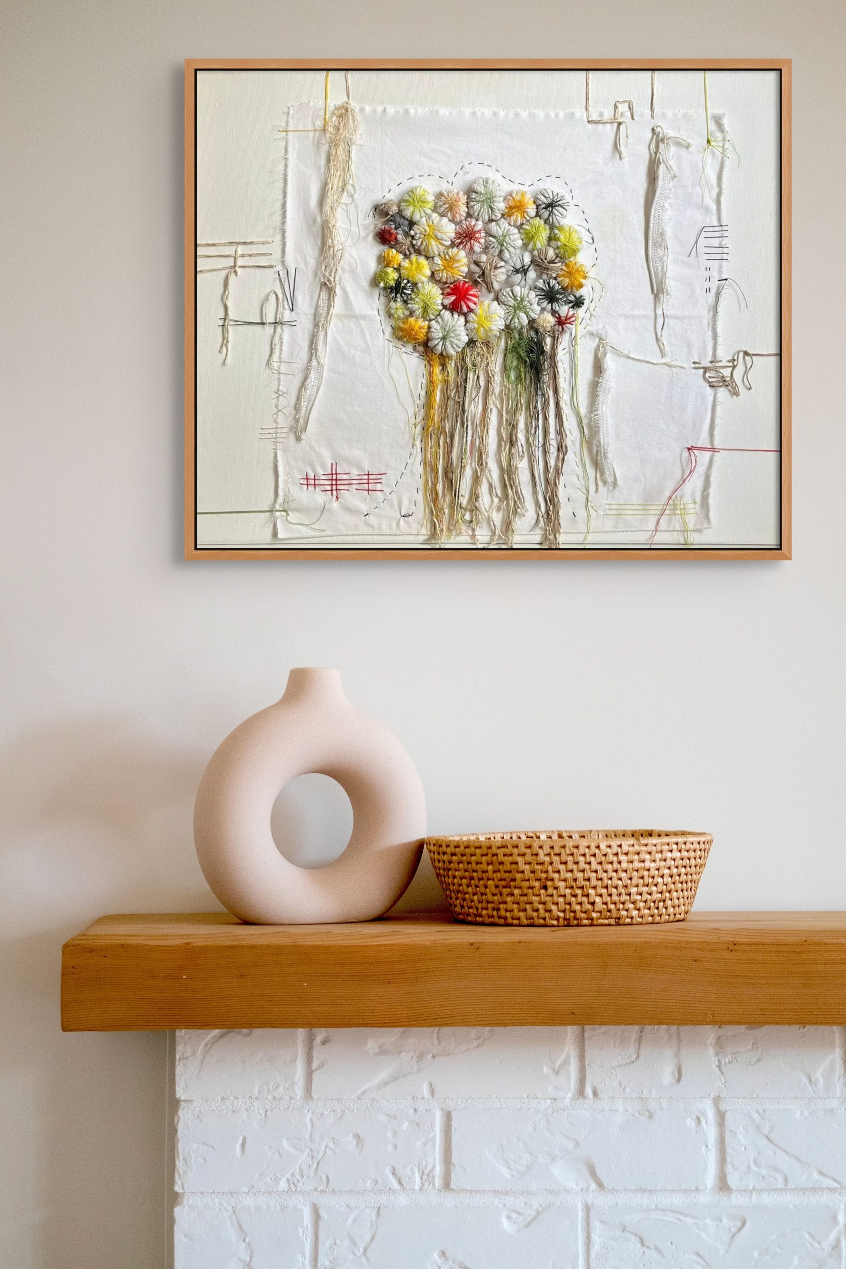 Assemblage of fabric remnants and leftover threads, hand-dyed, stitched on canvas. A collection of colorful thread spools are fashioned into a bouquet of blossoms on a piece of fabric with various loose threads and sketches around it. Embroidery techniques create a three-dimensional, tactile quality to the corals arrangement, and the intentional raw edges of the fabric add to the handcrafted charm.
